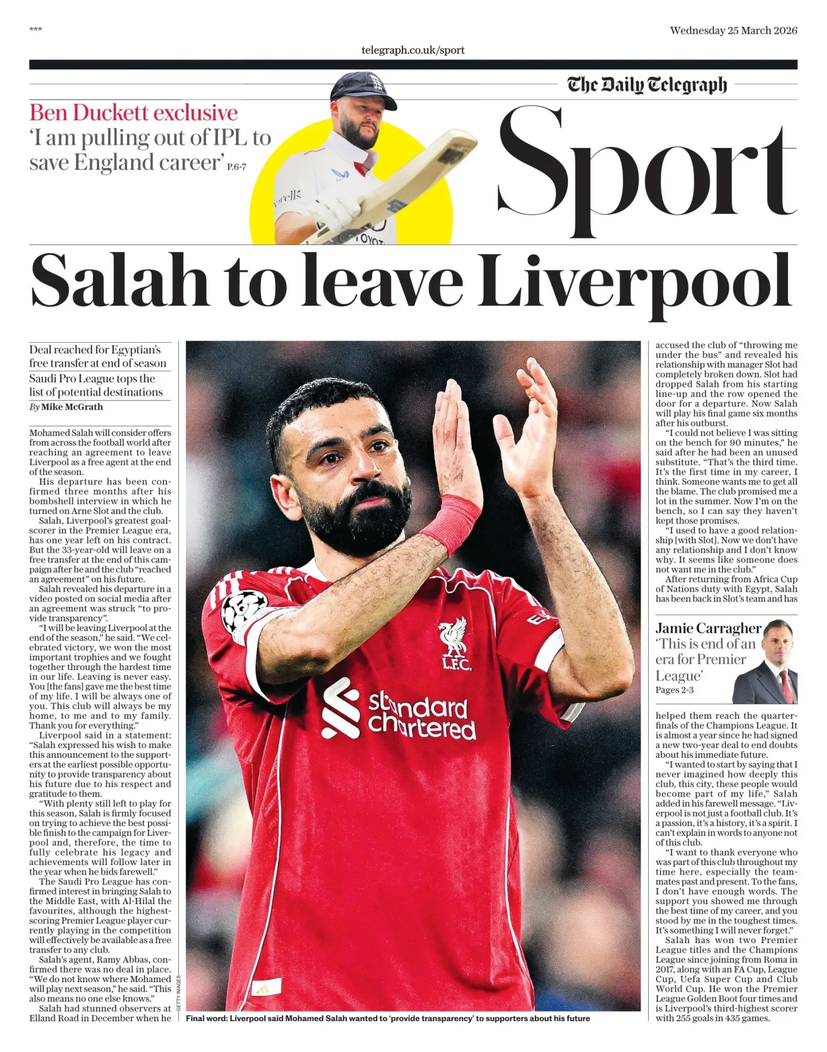 أصبح رحيل محمد صلاح عن نادي ليفربول بنهاية موسم 2025-2026 محور اهتمام جميع صحف إنجلترا اليوم الأربعاء 25 مارس 2026، بعد إعلان اللاعب المصري قراره بمغادرة آنفيلد، مع نهاية حقبة شهدت تحقيقه أرقامًا قياسية وألقابًا فردية جعلته أحد أبرز أساطير النادي، وتصدرت تعليقاته ورسائله العاطفية صفحات الإعلام البريطاني، بينما يتساءل الجميع عن مستقبل الملك المصري القادم.