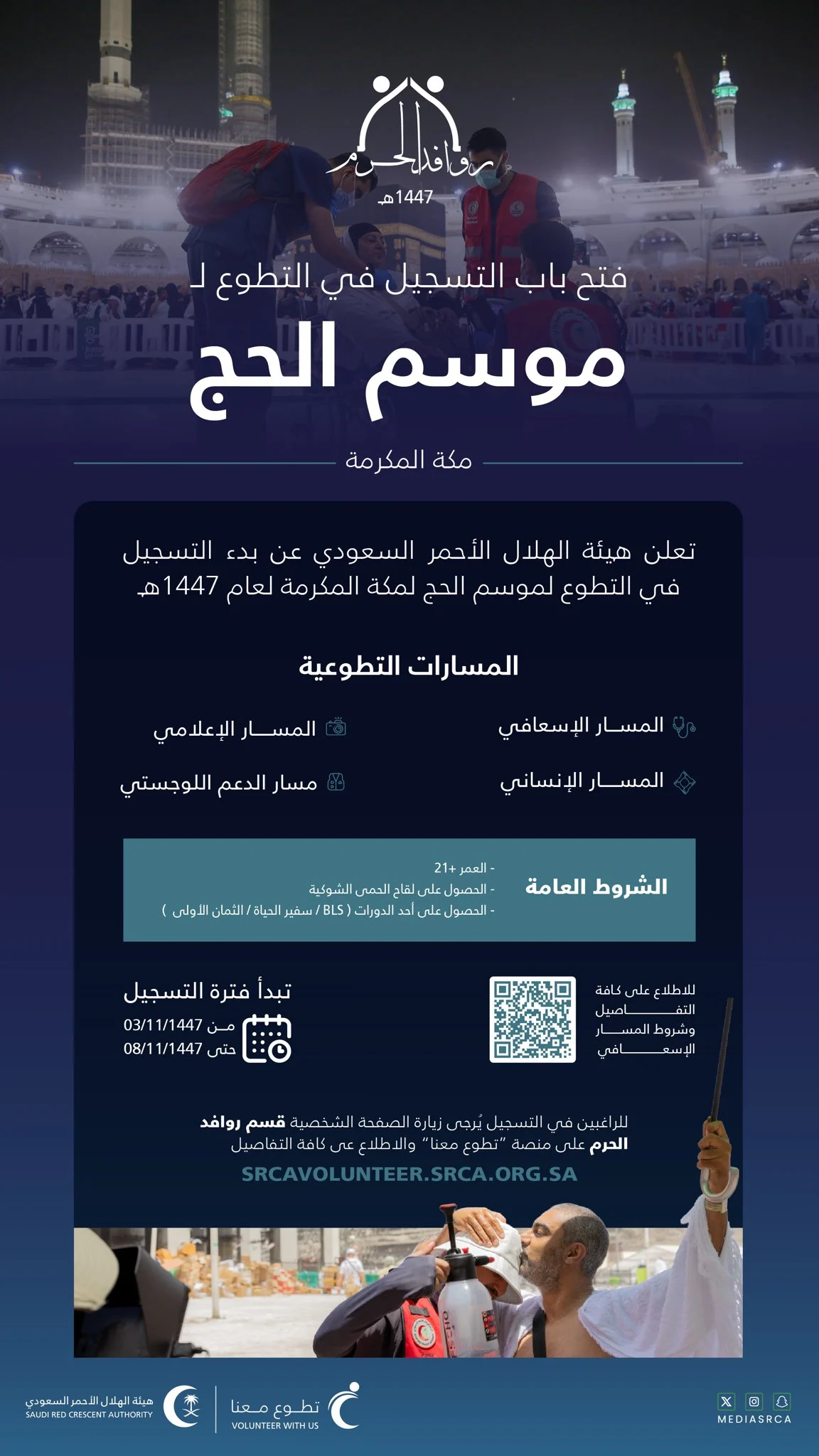 يوفر تطوع موسم الحج 1447 مع الهلال الأحمر السعودي فرصا متنوعة تشمل عدة مسارات رئيسية تساهم في تعزيز الرعاية الصحية واللوجستية للحجاج حيث أوضحت الهيئة أن المشاركة تشمل المسار الإسعافي الذي يركز على تقديم المساعدة الطارئة والإسعافات الأولية والمسار الإنساني الذي يدعم الجانب الاجتماعي والإغاثي ; كما يشمل المسار الإعلامي لتوثيق الجهود ونشر الوعي والمسار الدعم اللوجستي لتنظيم العمليات الميدانية ; هذه المسارات تجعل التطوع فرصة حقيقية للمساهمة في نجاح موسم الحج.