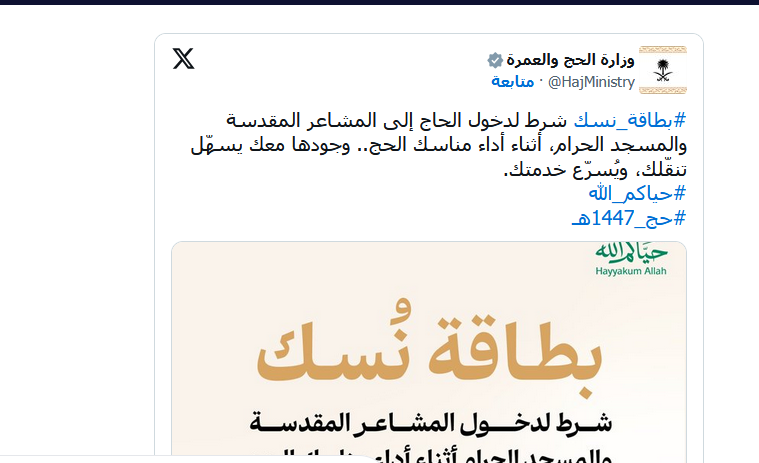 أكدت وزارة الحج والعمرة في تصريح هام من الحج والعمرة حول الدخول إلى المشاعر المقدسة والمسجد الحرام أهمية الالتزام بالإجراءات التنظيمية الجديدة، وعلى رأسها حمل بطاقة نسك طوال فترة المناسك، لما تمثله من وسيلة أساسية لتسهيل الحركة والتحقق من التصاريح، وضمان تقديم الخدمات للحجاج بسهولة وانتظام خلال موسم الحج هذا العام بالكامل.